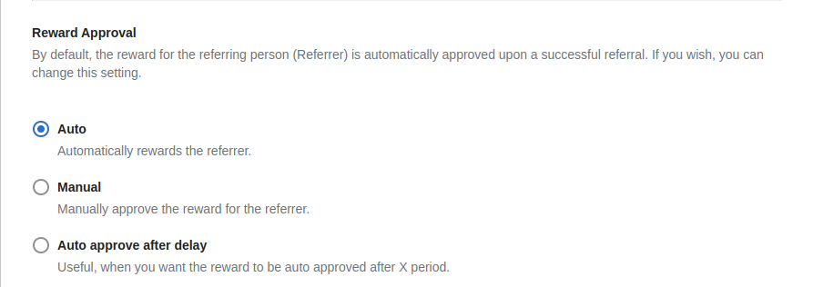 By default, the reward for the referring person (Referrer) is automatically approved upon a successful referral. If you wish, you can change this setting.